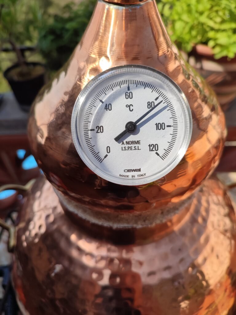 Una vez se alcanza la temperatura y comienza a destilar, tendremos que desechar las primeras gotas, pues lo primero que destila es el alcohol metílico que es toxico. Cuando la temperatura se estabilice a 80 grados, desecharemos lo destilado y ahora si obtendremos el espíritu del vino. Llegado a este punto, ya podríamos bajar la temperatura si lo deseamos, pues el alcohol metílico ya se ha eliminado.
