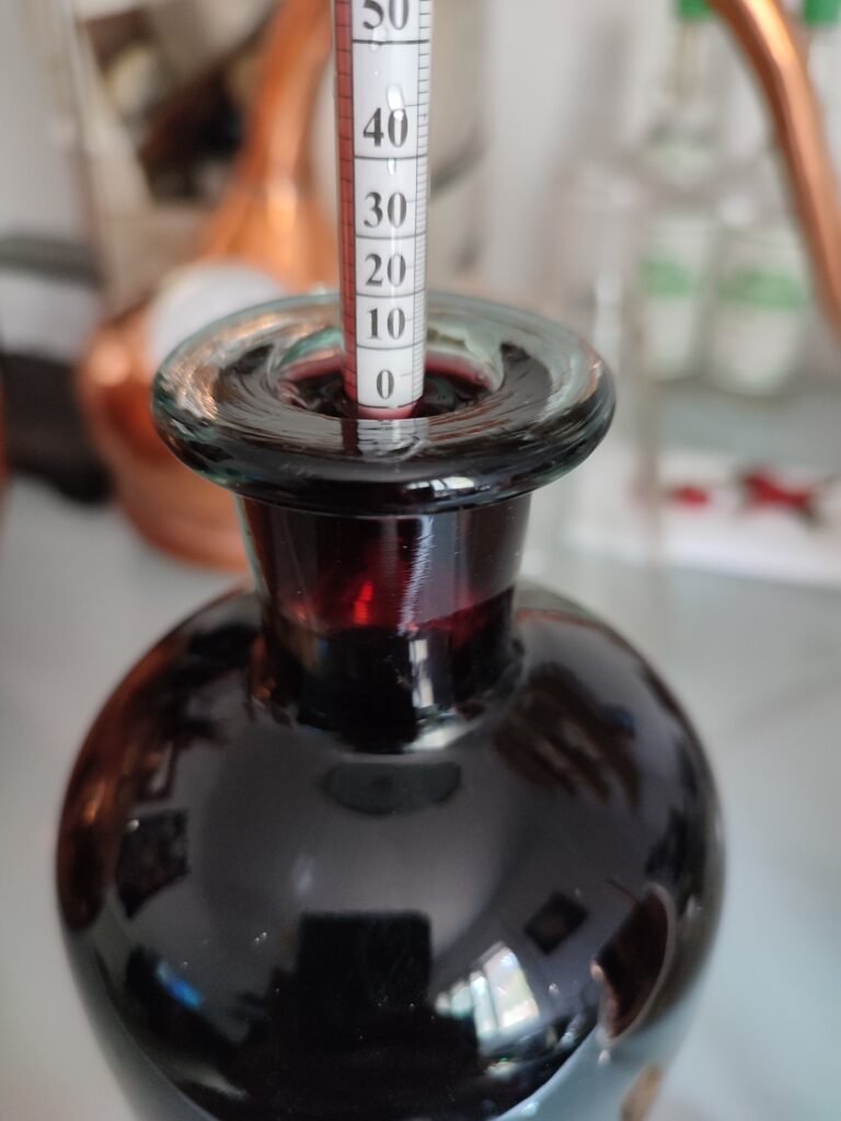 Hemos obtenido el espíritu del vino y también un mosto, que es lo que queda en el tanque del alambique. Usaremos el alcoholímetro para ver los niveles de alcohol.